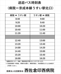 【千葉ニュータウンルート】4/1より運行開始のお知らせ 2026/04/01 最終更新日時 : 2026/04/04 nishisakura 当院では、印西牧の原駅および千葉ニュータウン中央駅より送迎バスの運行を開始いたしました。 通院・ご面会の際にぜひご利用ください。 詳細は【送迎バスのご案内】をご覧ください。